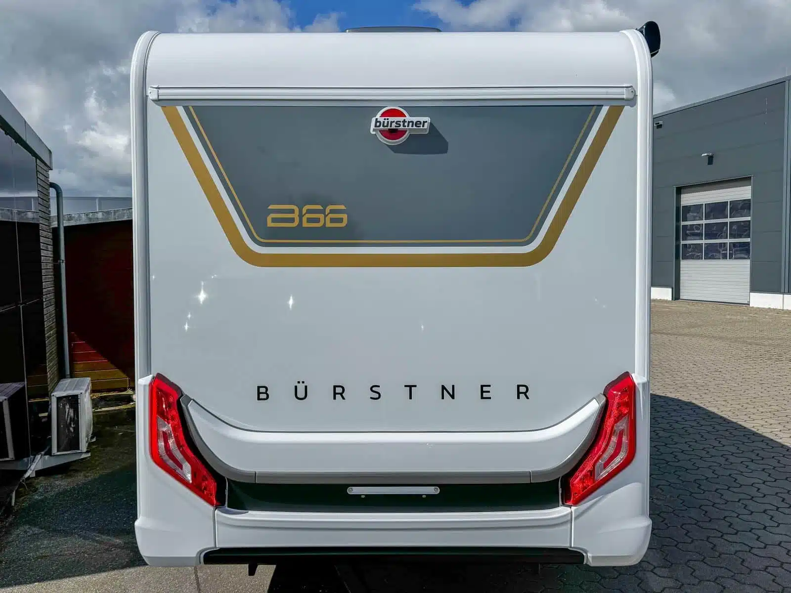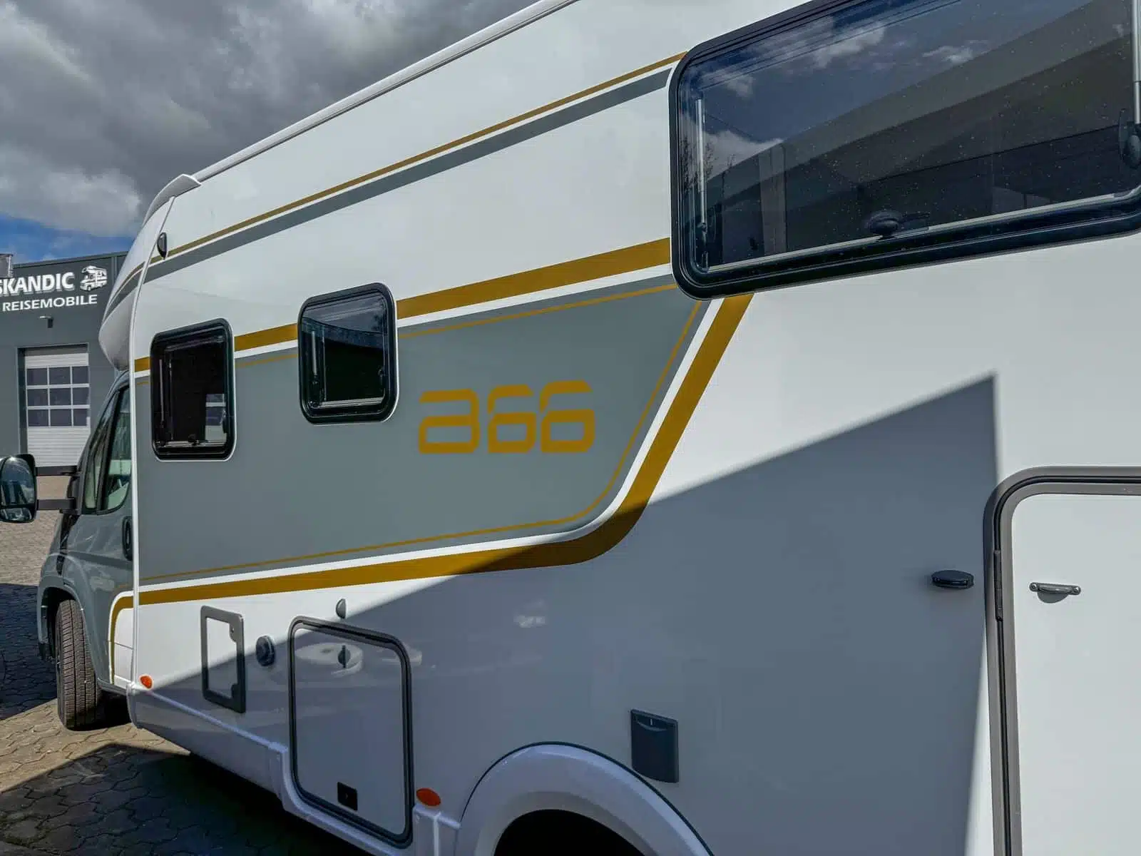 - Konstruktion – bred karosseridør med vindue – indgang til coupé – mørklægningsgardiner og myggenet – udtrækkeligt trin – GFK-tag og GFK-gulv – serviceklap i venstre og højre side – indrammede vinduer – specialproduktgrafik B66 – markise 4,0 m – myggenet til karosseridør