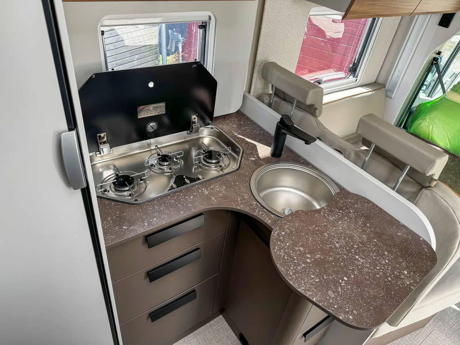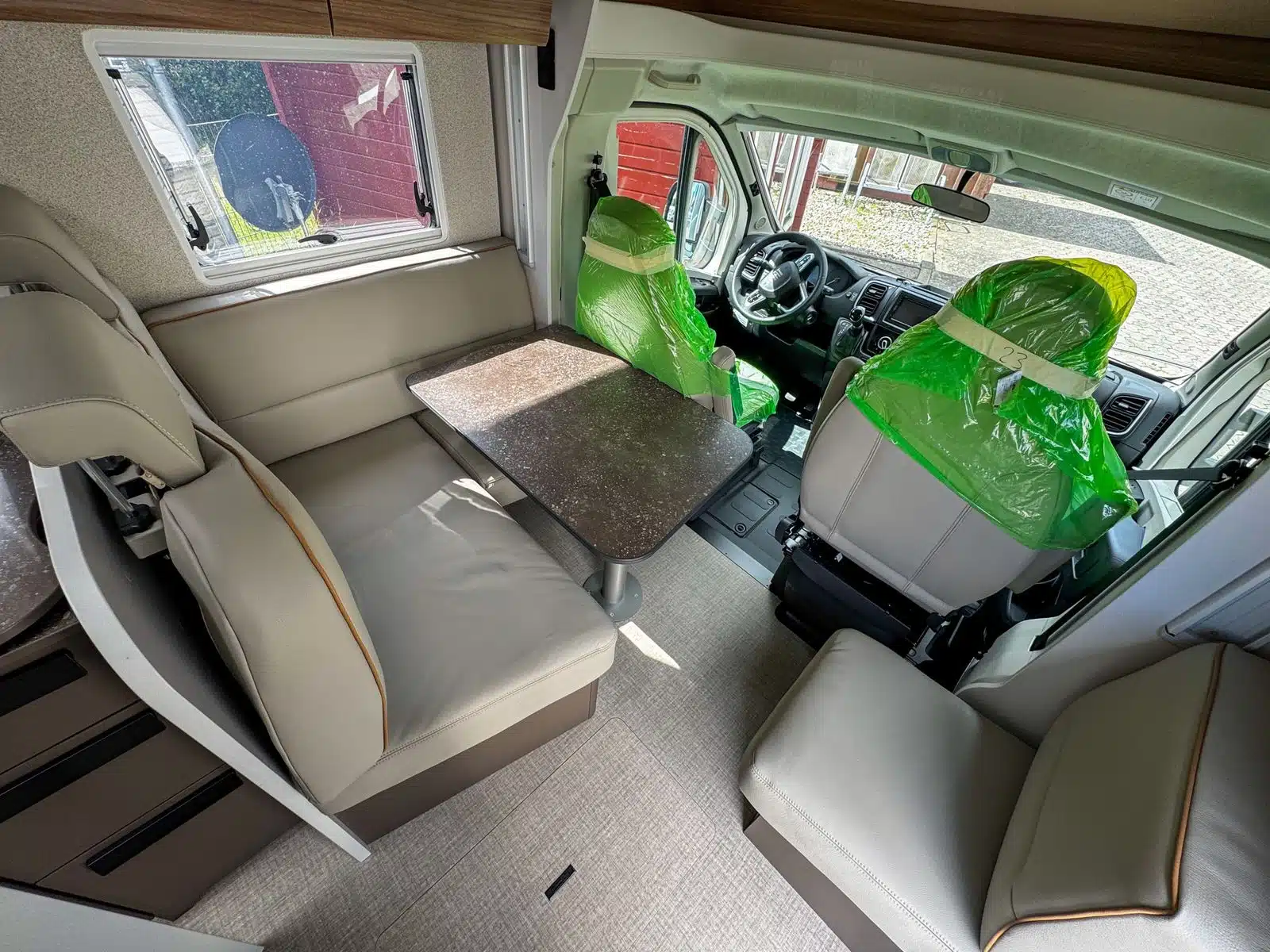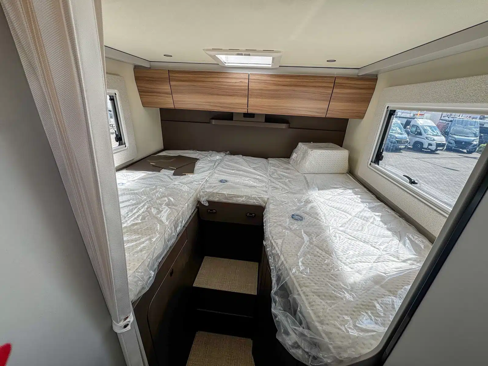 - Opholds- og soveområde – opbevaringsrum i gulvet, tilgængeligt fra opholdsområdet – læderbetræk B66 med broderi – komfortskummadrasser med flere zoner til alle sengevarianter – møbeldekor B66 – L-formet siddegruppe inklusive bordfod med én søjle, bordpladen er flytbar – fastgørelsesøje med skinne i bagagerum – ekstra hynde til omdannelse af enkeltsenge til dobbeltsenge