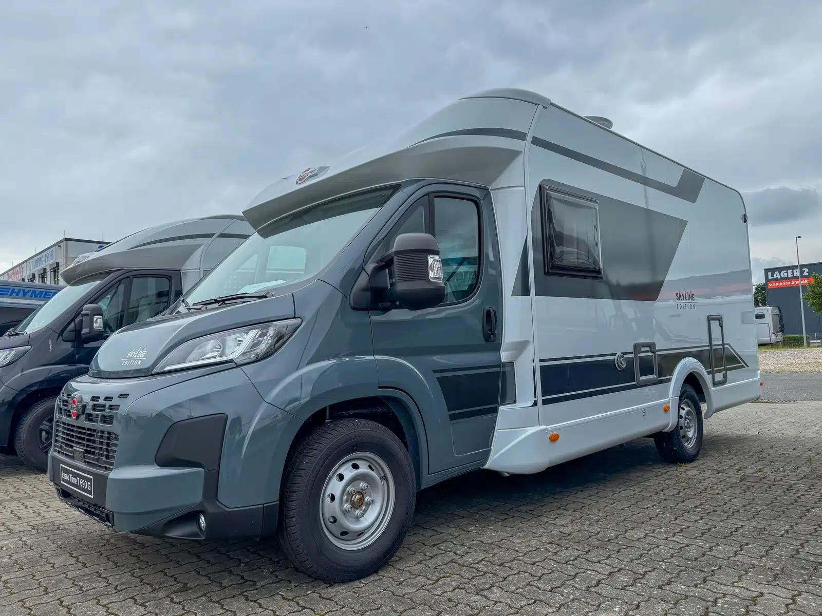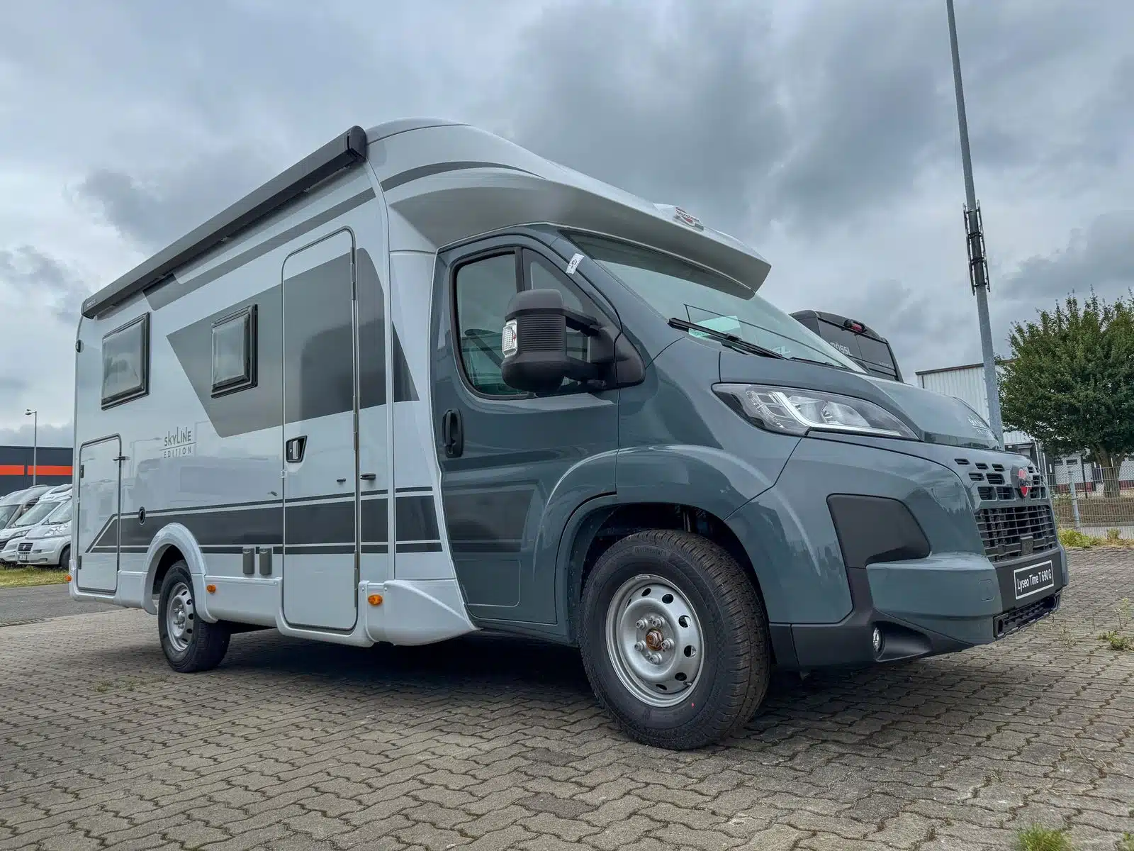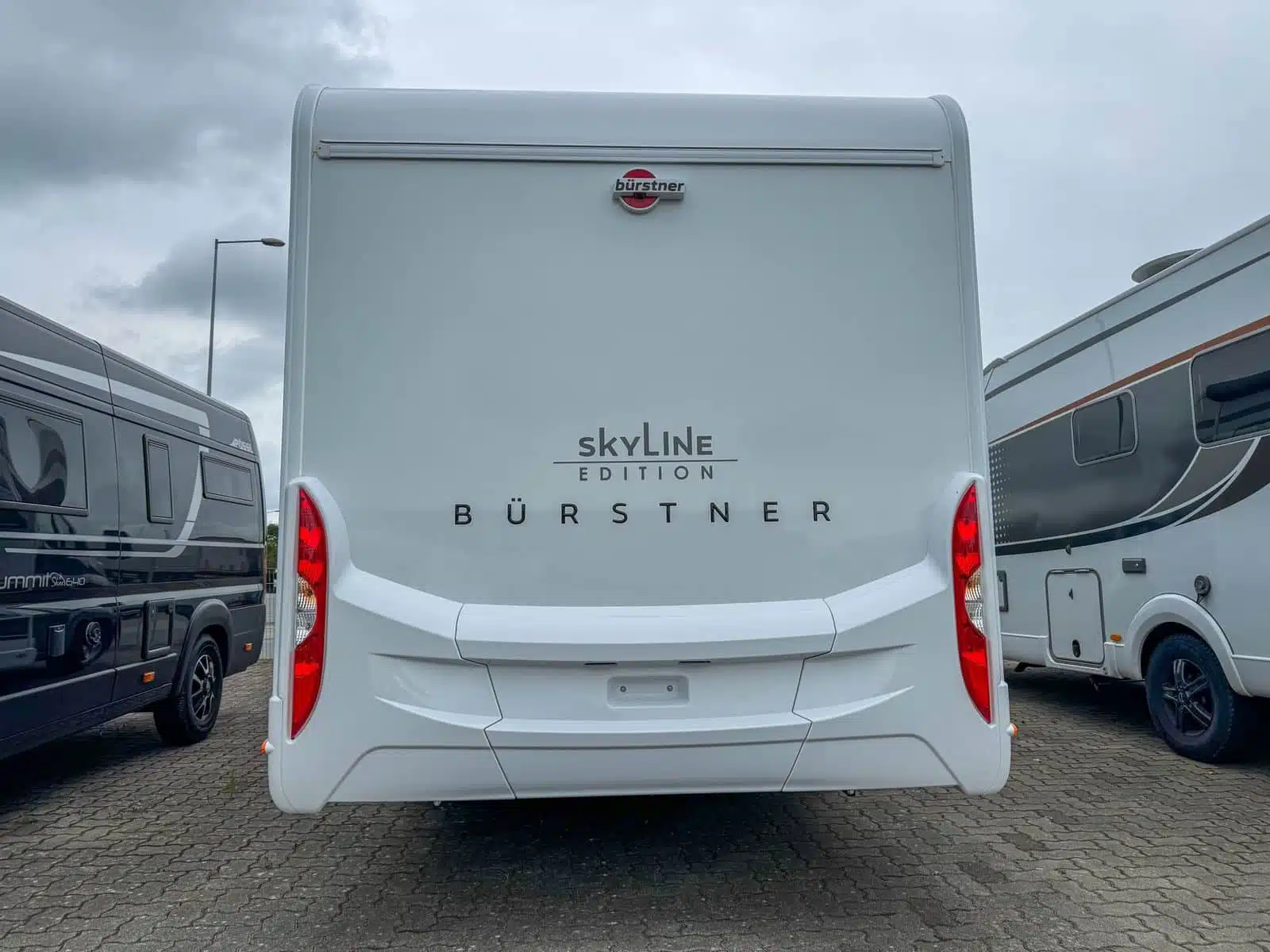 - Edition Skyline 2025 (Bürstner SkyLine Edition (Fiat Ducato Multijet 3 – 2,2 L – 140 HK – Euro VI E inkl. 8-trins automatgear (Heavy Duty), Lanzarote grå lakering (førerhus), frontspoiler lakeret i karrosserifarven, coupé-indstigning, XL-karrosseridør, multimediestation inklusive bakkamera, radioforberedelse inklusive DAB+ og antenne i sidespejlet, markise, polstring med “SkyLine Edition”-broderi – læder, L-siddegruppe inklusive bordfod med én søjle, bordplade der kan bevæges i alle retninger, Teleco HD Telesat 65 cm satellitsystem, beslag til fladskærm