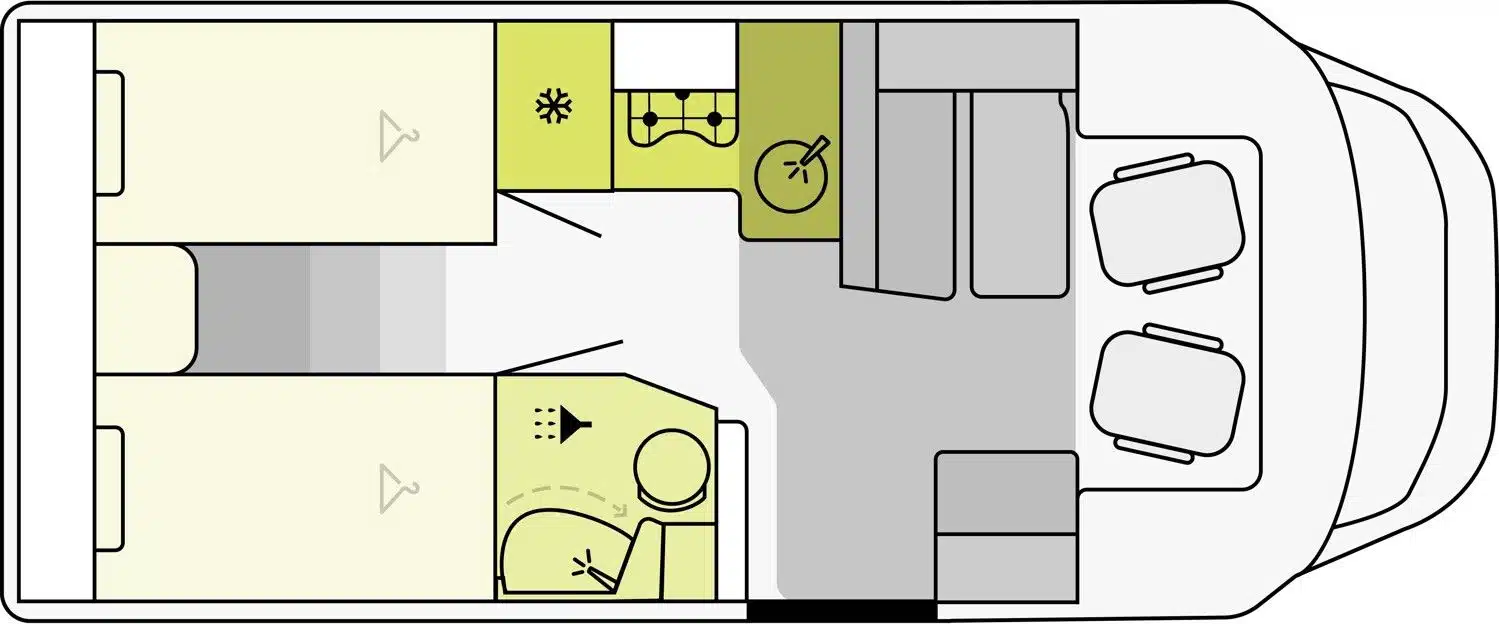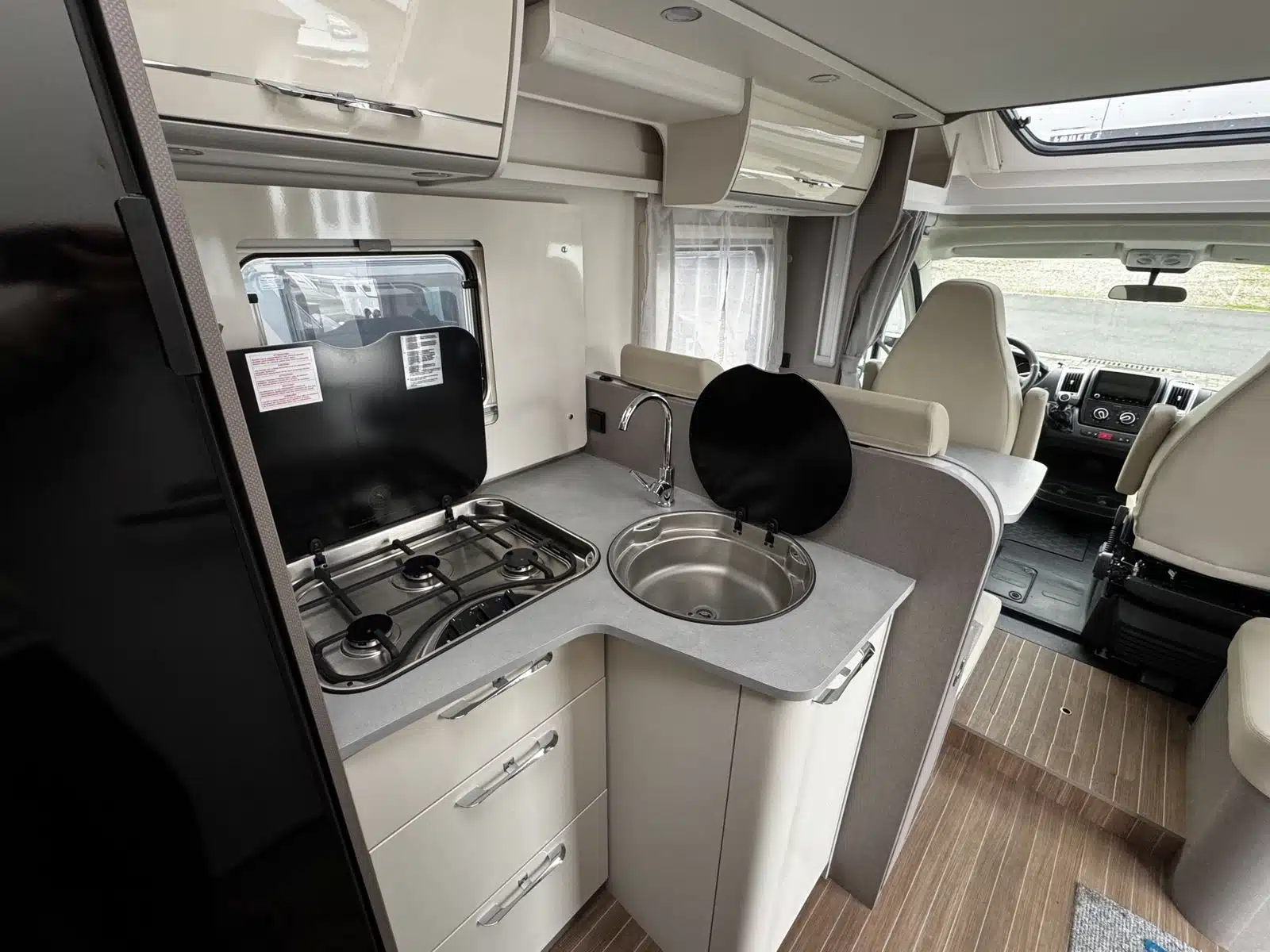 - Komfort Paket (Spiegel mit indirekter Beleuchtung und Garderobenhaken, Holzlattenrost in der Dusche, Fahrerhaussitze inkl. Wohnraumbezügen, Steckdose im Dachschrank über dem Küchenblock, Steckdose in der Garage)